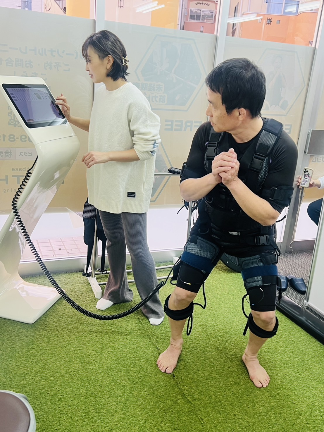 疼痛抑制(施術)+股関節・胸椎の可動性不足、周囲の関節の可動性改善(施術、運動療法)+ 腰椎の安定性改善(腹式呼吸、ドローイン、EMSトレーニング、運動療法)